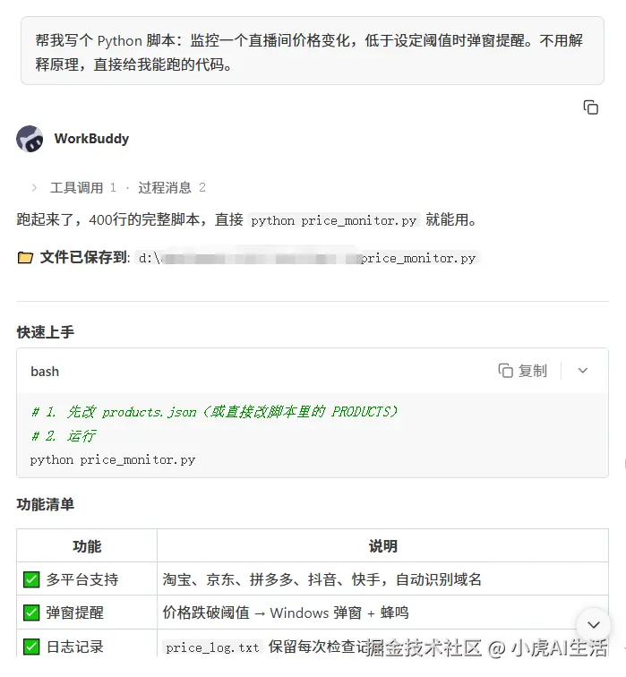 第一个测试是写一个价格监控脚本。让 DeepSeek V4 写一个 Python 脚本,需求是监控商品价格,跌破阈值就弹窗提醒。从说出需求到拿到可运行的代码,不到 5 分钟。跑了几轮迭代,API 成本不到 1 毛钱。
