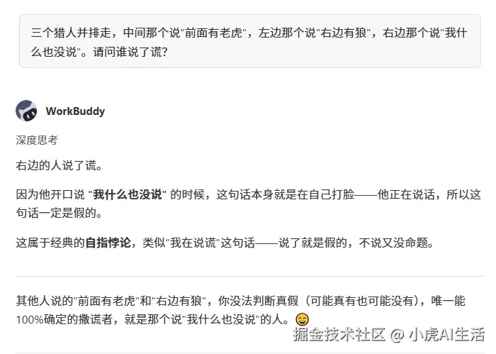 第三个测试是逻辑推理。一个经典的三个猎人题目,它答对了,推理过程清晰。