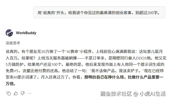 第二个测试是中文口语化。让它用"说真的"开头讲个 200 字的创业故事。输出没有翻译腔,节奏自然,语气像真人说的。这个任务 DeepSeek V4 完成得很顺。
