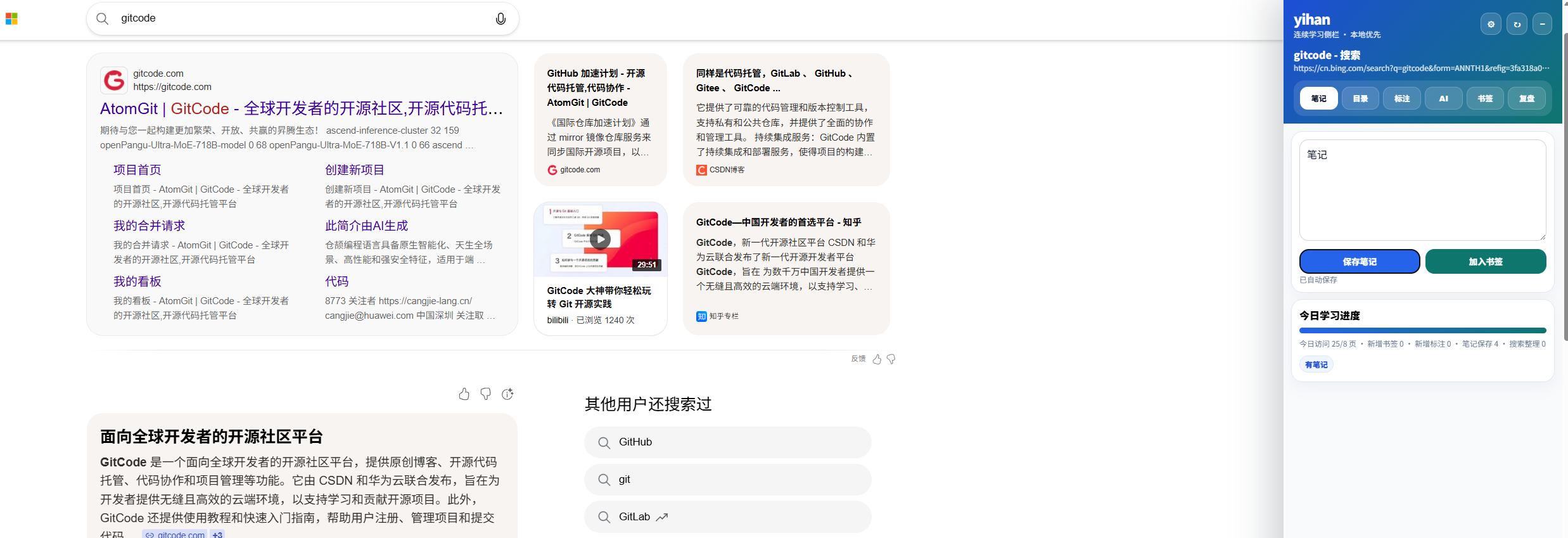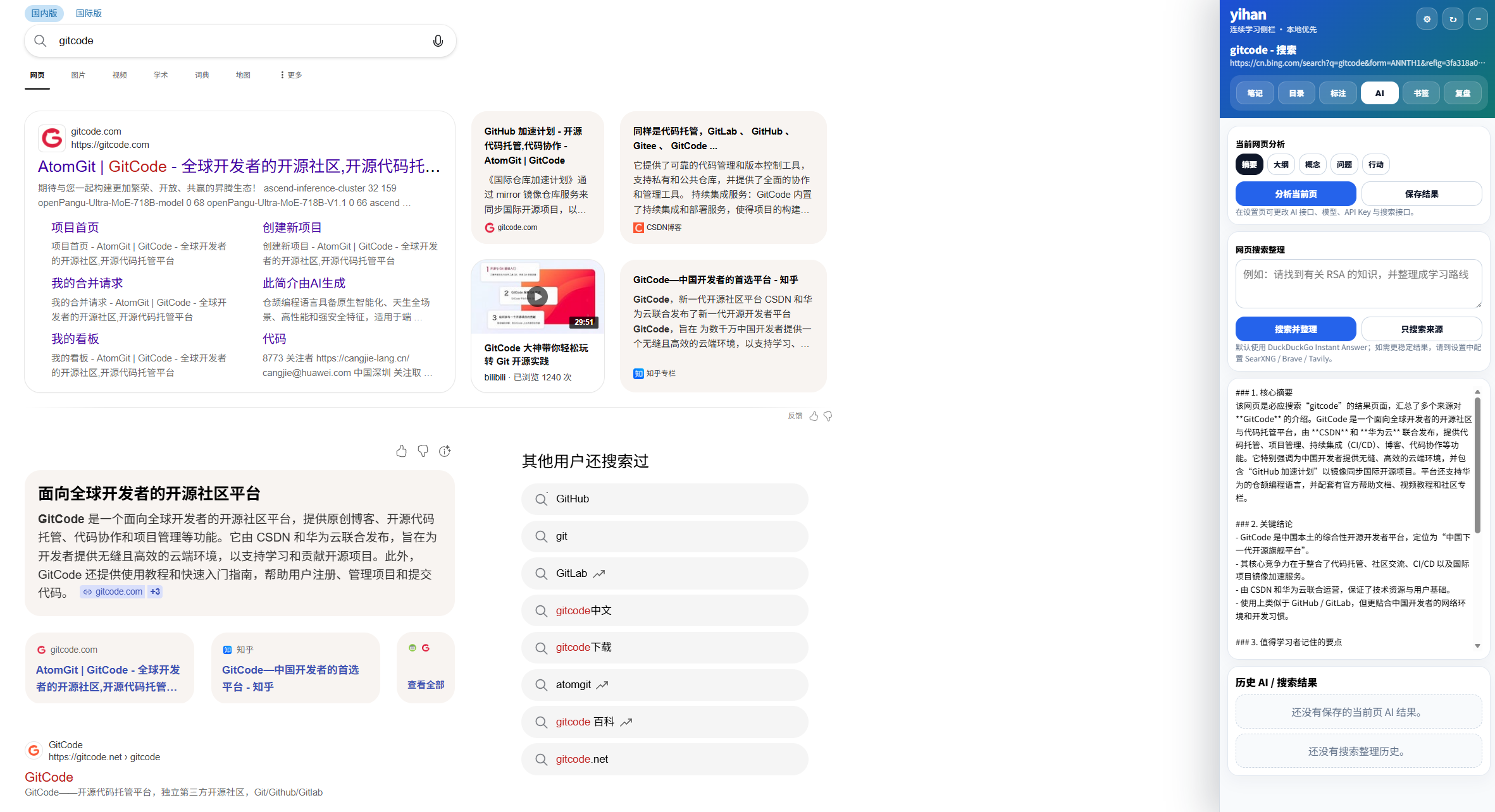 当用户打开 yihan 后,它会以侧边栏的形式显示在网页右侧。用户可以继续浏览网页,同时在侧边栏中记录笔记、查看书签、调用 AI 分析、整理搜索结果。这种方式更接近一个"网页学习工作台"。