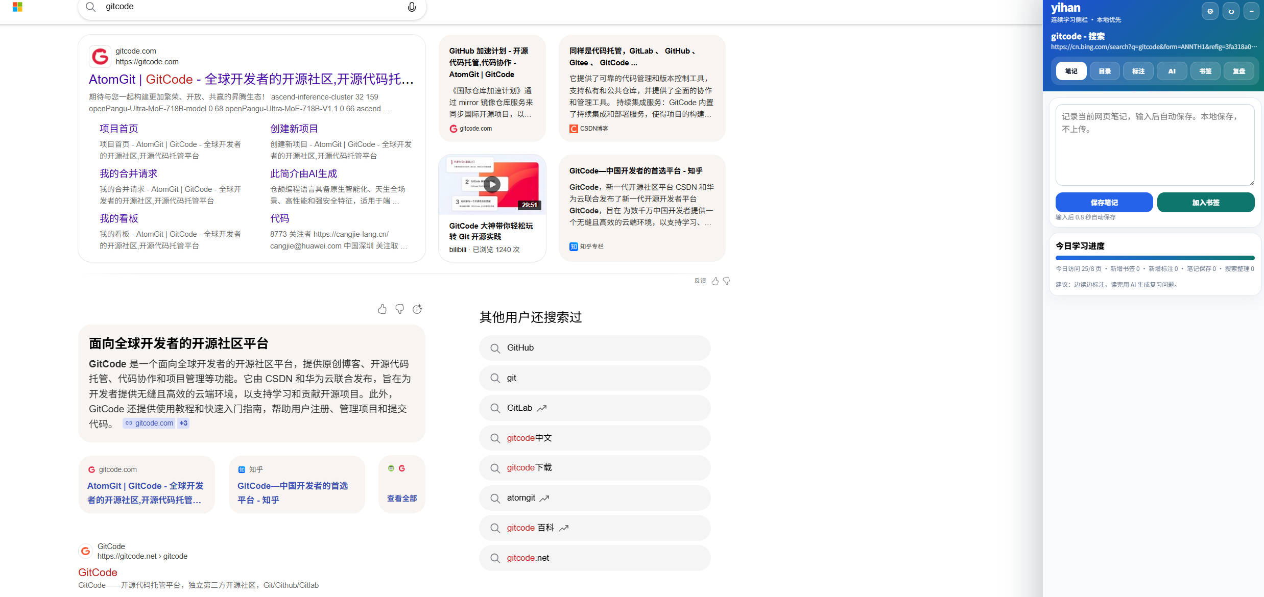 yihan 是一款面向连续网页学习场景的浏览器侧边栏插件,支持 Google Chrome、Microsoft Edge 和 Firefox。它可以帮助用户在浏览网页时完成笔记记录、文字标注、学习书签管理、网页保存、AI 页面分析以及网页搜索整理等操作,从而形成一个更加连贯的学习工作流。
