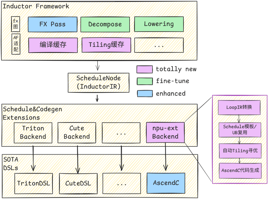 AutoFuse扩展了inductor在NPU上的Codegen后端,通过将InductorLoopIR转换为AscIR,调用AutoFuse模块进行Schedule模板选择、UB复用与Tiling调优,生成高效的Ascend C Kernel实现。