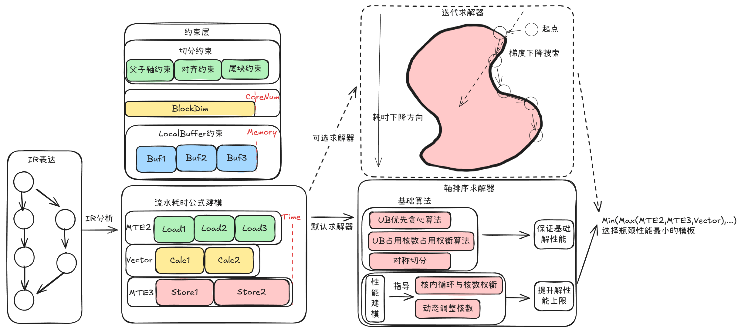 - Auto Tiling:结合输入shape和硬件约束从候选优化图中选择最合适的优化图,并计算出此种优化图下最佳的Tiling参数。